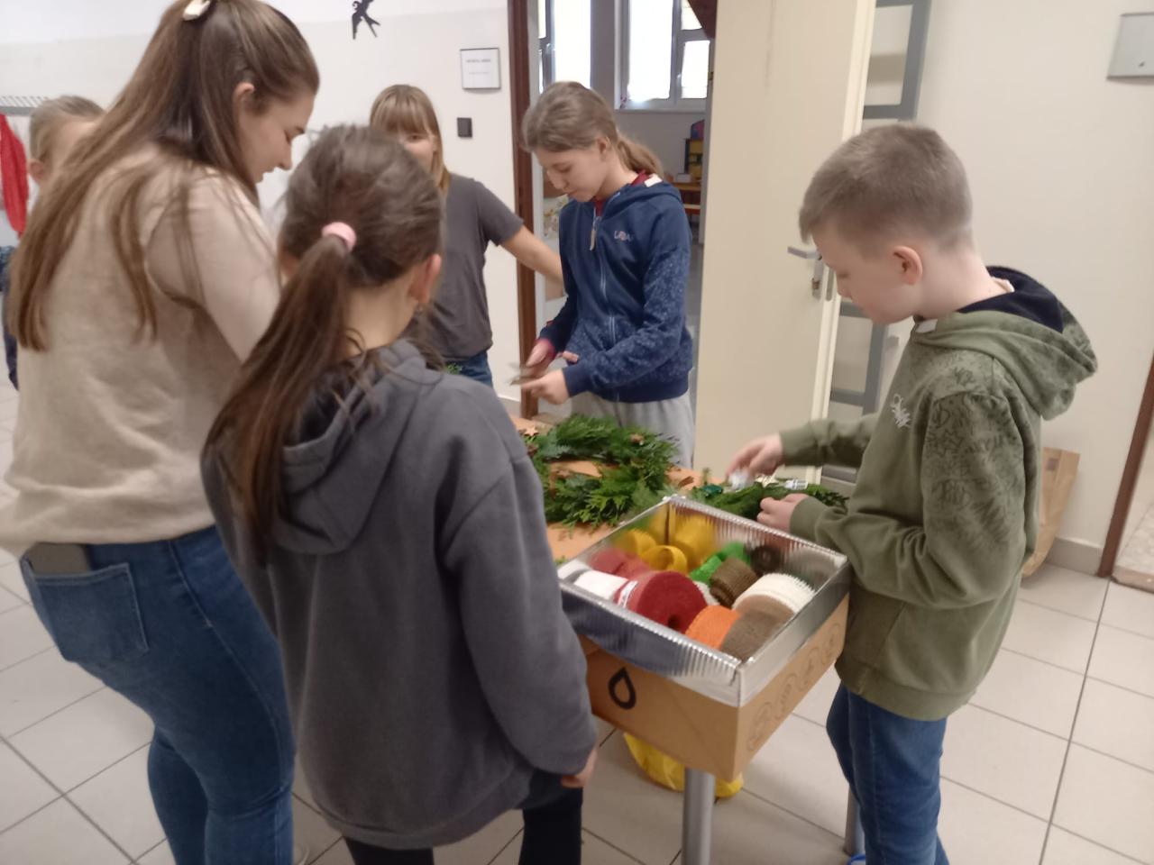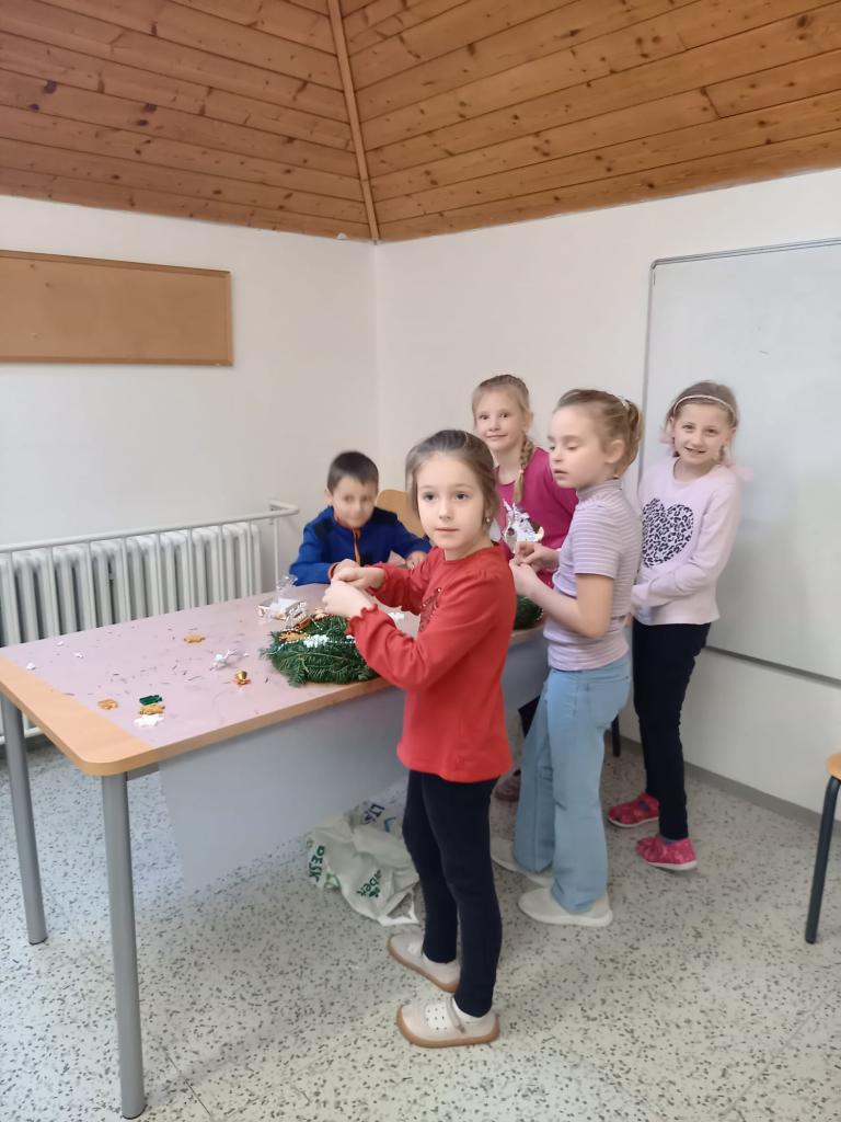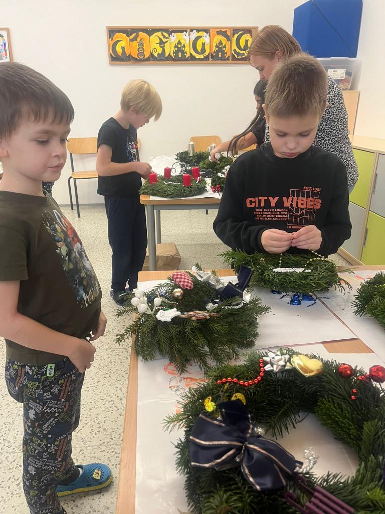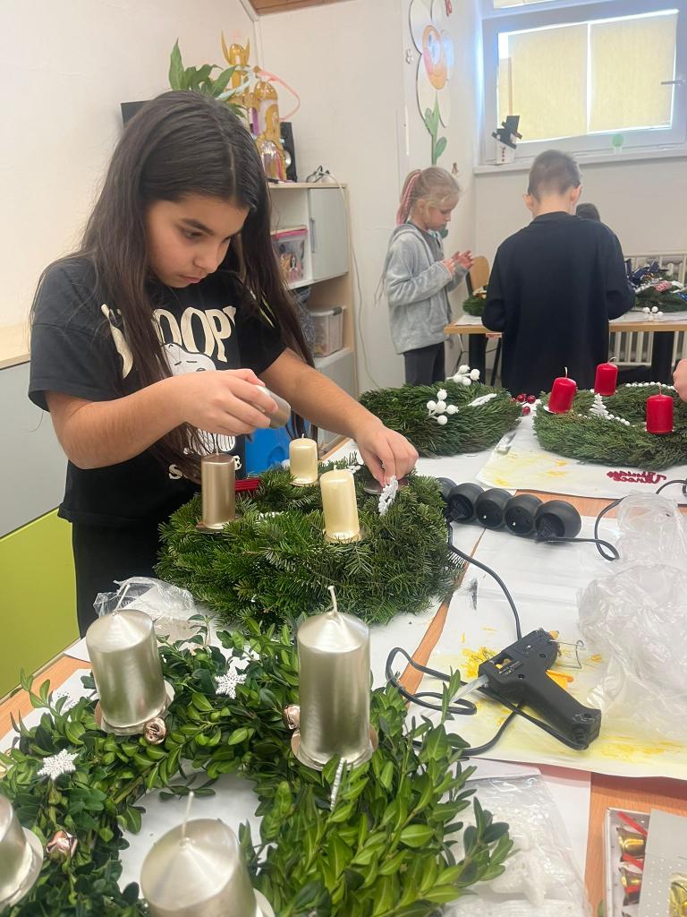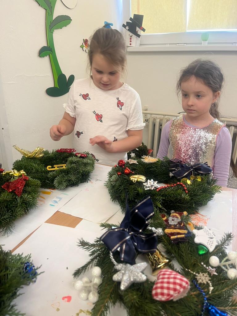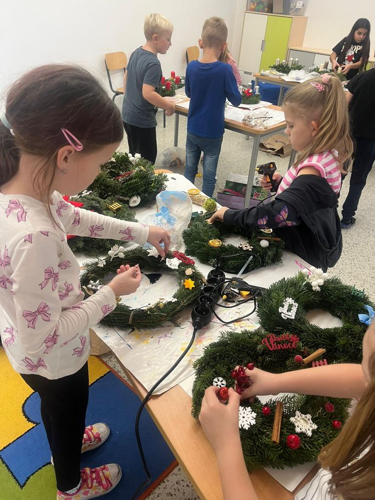 Děti si přinesly vlastní připravené věnce a ve družině je zdobily různými dekoracemi podle své fantazie. Někdo si vytvořil věnec na stůl se svíčkami, jiný zvolil věnec na dveře k zavěšení.