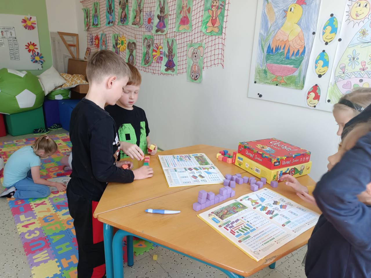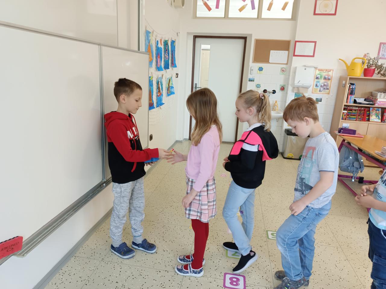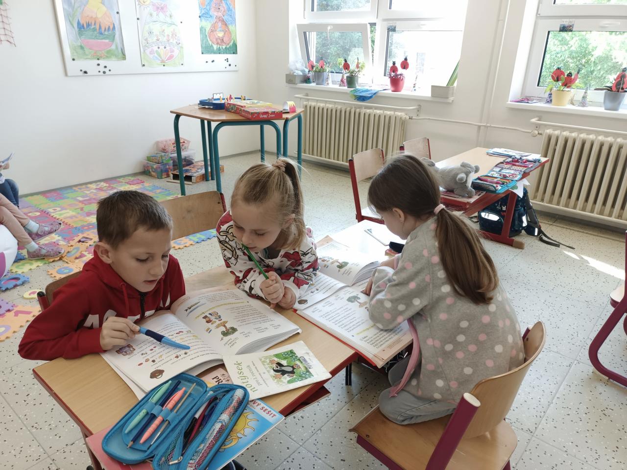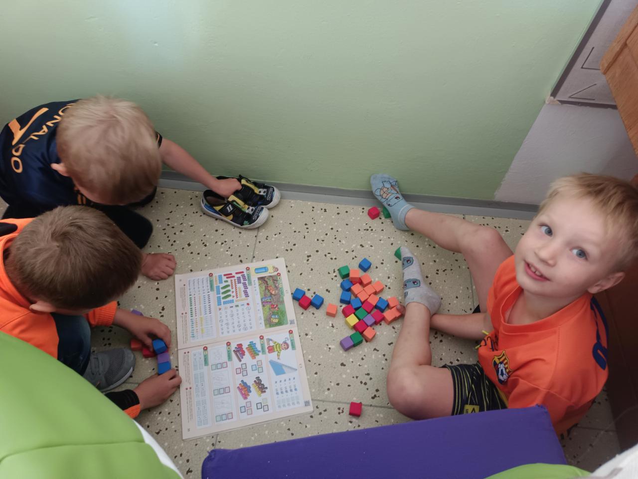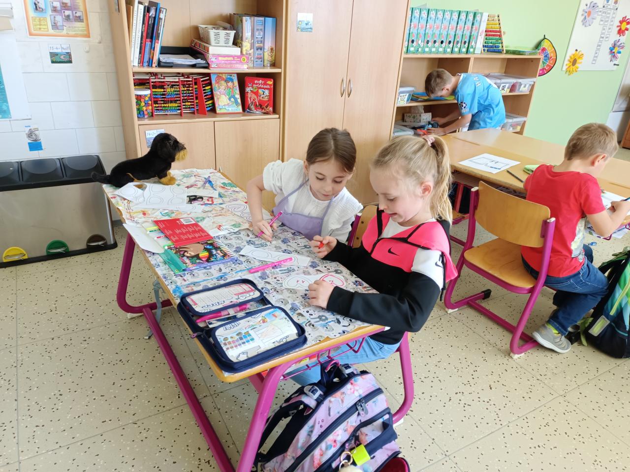 O výtvarné výchově malujeme moc hezké obrázky, které nám zdobí třídu a chodbu. O matematice počítáme do 20,stavíme si z kostiček.Učíme se pracovat s kamarády ve skupině.